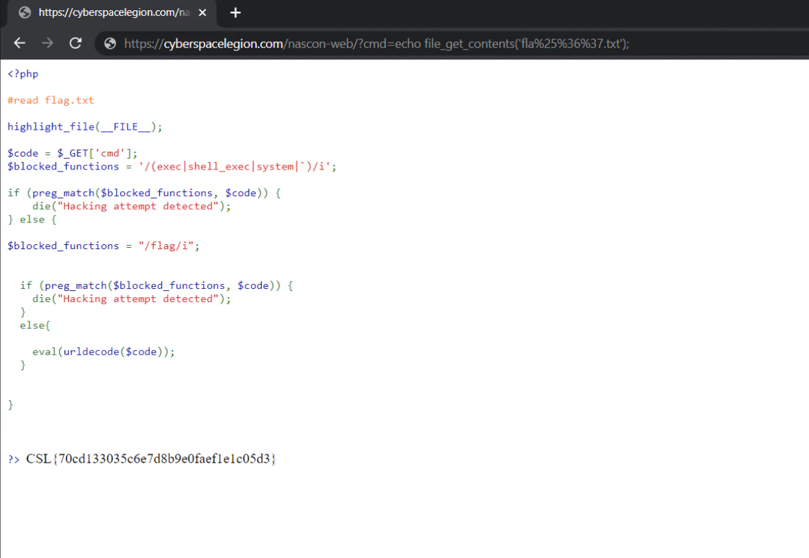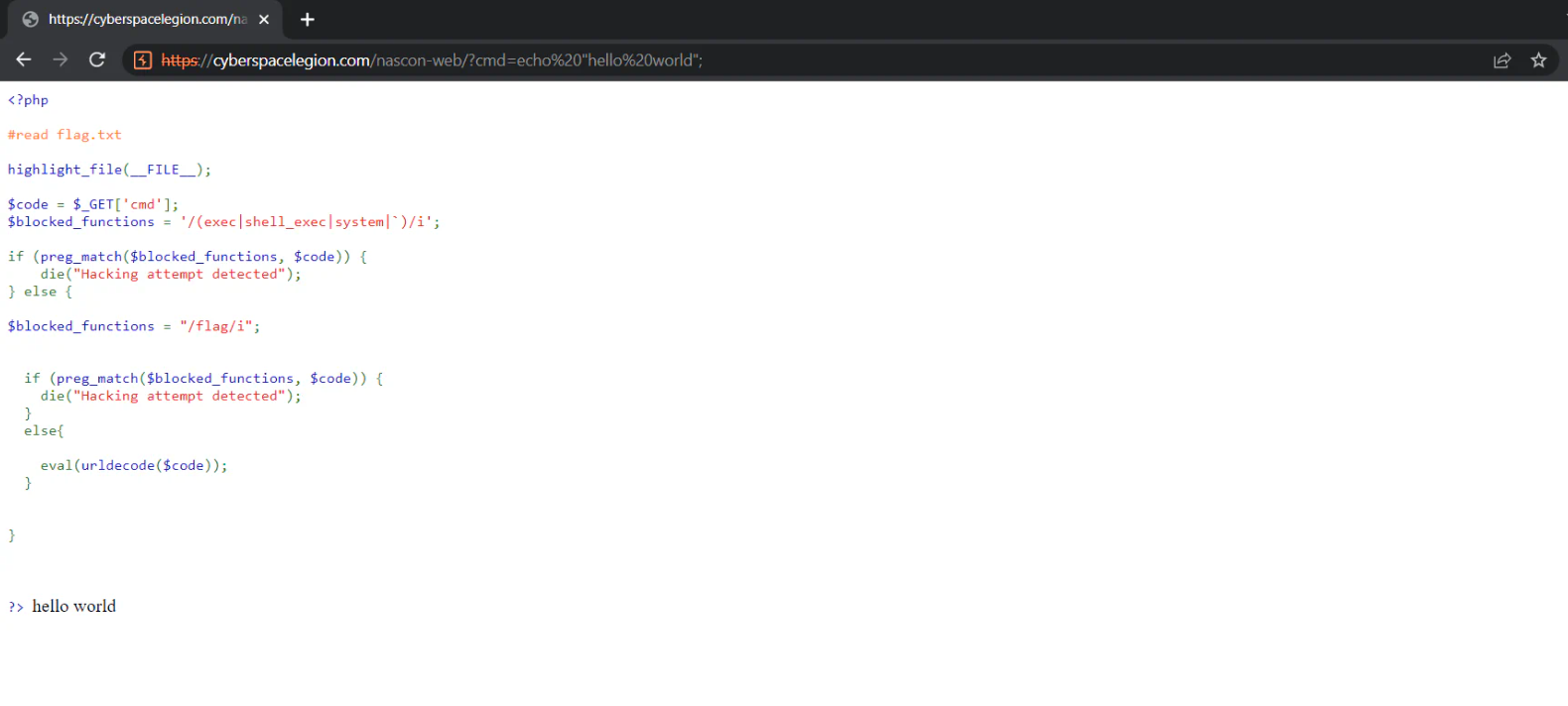 Initially, It highlights the code file. Then it stores the 'cmd' get parameter value in code variable, it blocks all the functions through which we can execute the shell commands.