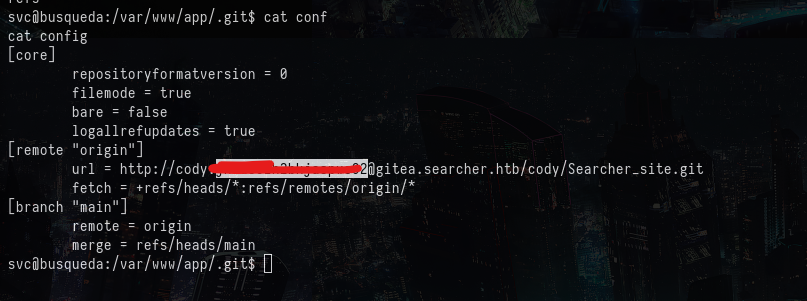 After gaining the initial access, I explored the current directory. It contain a .git folder. The config of the git repository contains a password as shown below: