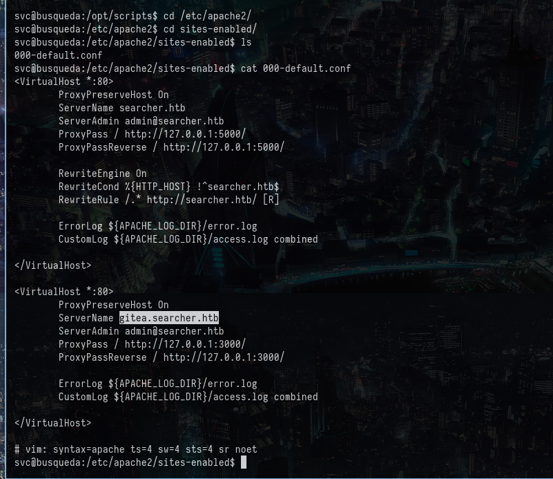 This gave us another password, which initially didn't understand. But after further enumeration, I figured out that there was another website running on the gitea.searcher.htb. This was found on the apache2 enabled sites as shown:
