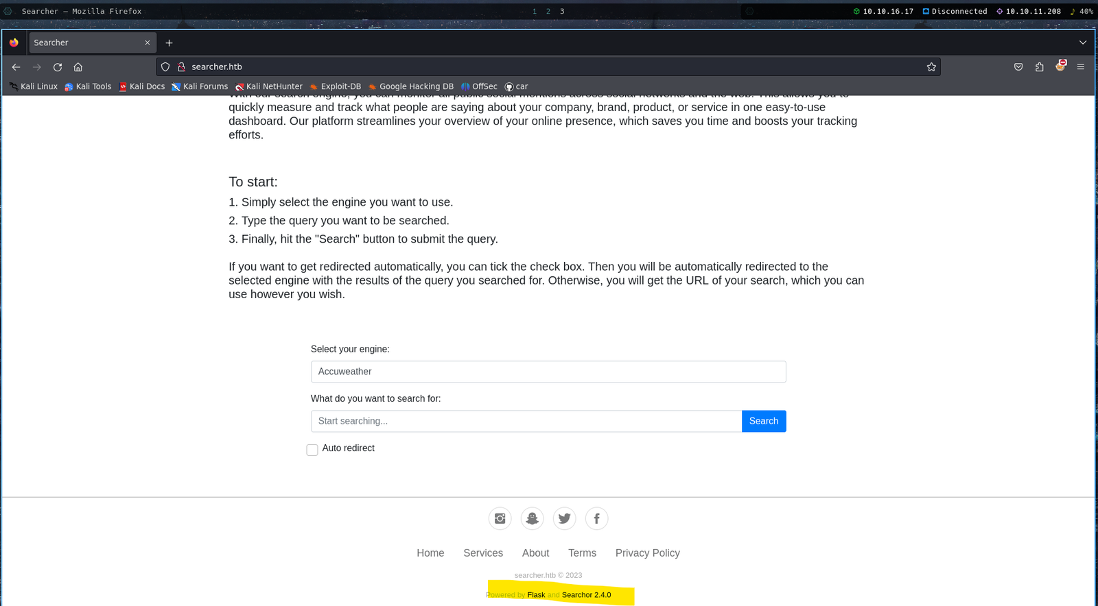 At the end, the version of the Searchor is shown, which is Searchor 2.4.0. Quickly searched if there's any vulnerabilities related to this version.