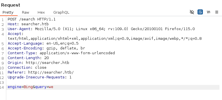 This shows the searcher.htb as the hostname. So updated it in the /etc/hosts file.